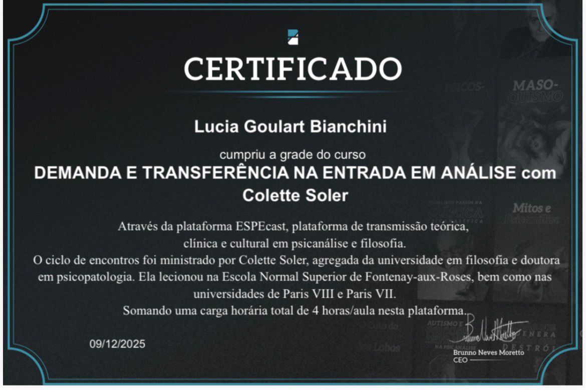 Participo regularmente das atividades da Sociedade de Psicanálise Iracy Doyle (SPID). Estudo, supervisão e prática caminham juntos: é assim que eu sustento o cuidado do trabalho clínico.